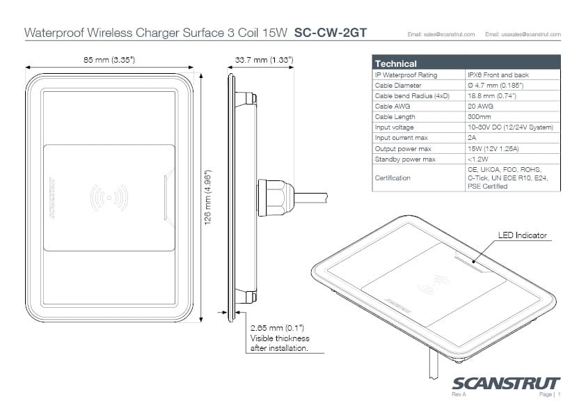 SC-CW-2GT Wodoodporna ładowarka bezprzewodowa, na powierzchnię, 3 cewki, 15W, 12/24V