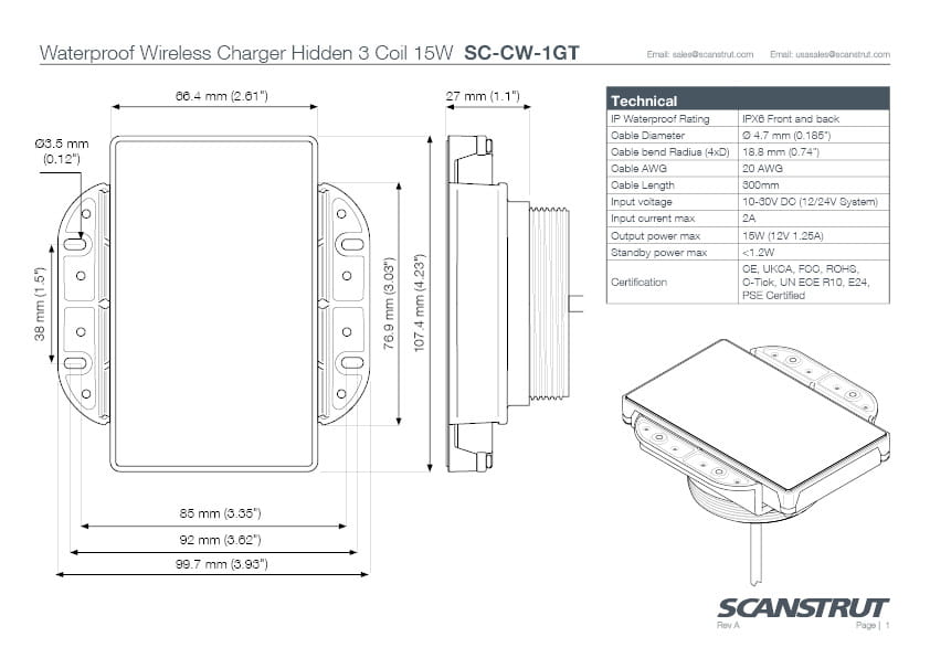 SC-CW-1GT Wodoodporna ładowarka bezprzewodowa, ukryta, 3 cewki, 15W, 12/24V