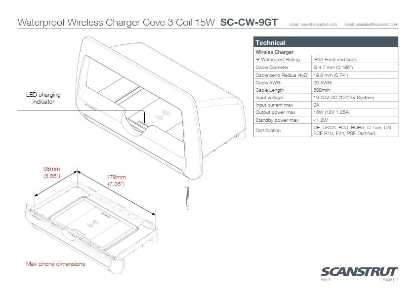 SC-CW-9GT Wodoodporna ładowarka bezprzewodowa Cove, 3 cewki, 15W, z kieszenią na telefon, 12/24V