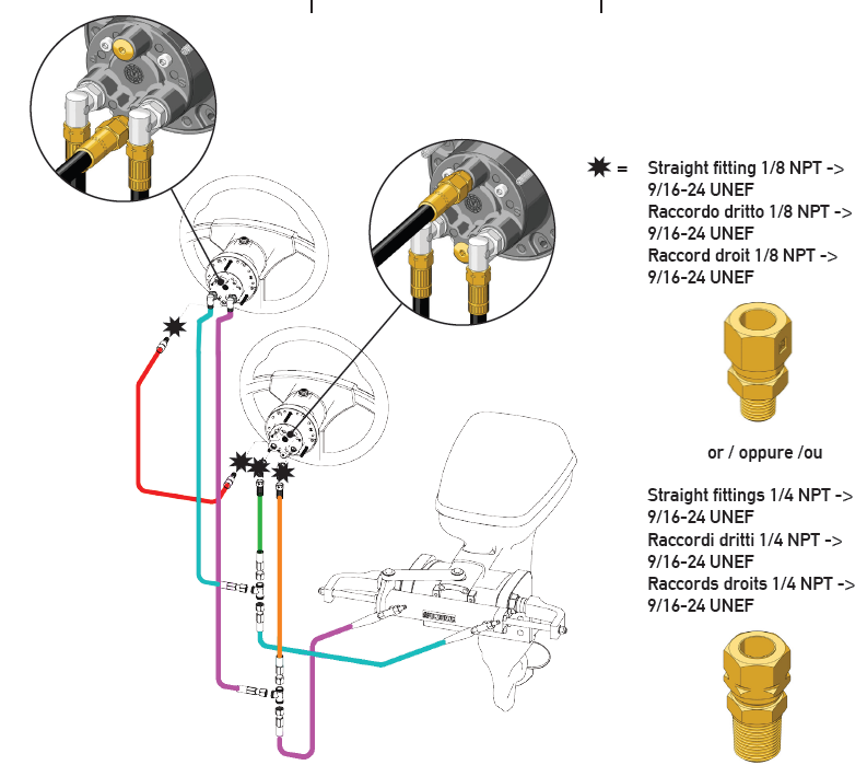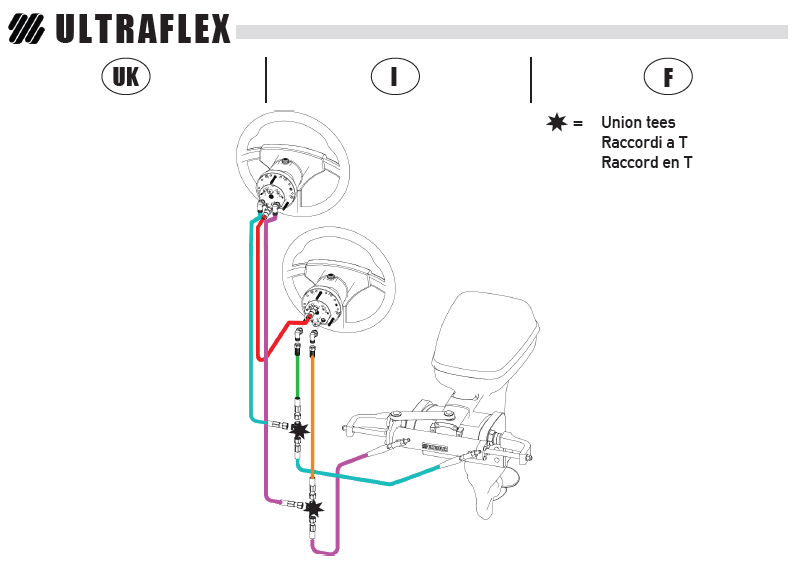 Zestaw połączeniowy z wężami i złączkami do autopilotów hydraulicznych lub do użytku z drugą stacją sterującą. Nadaje się do zestawów hydraulicznych Uflex Hyco, Hytech, Nautech i pomp hydraulicznych z funkcją obejścia z wężami hydraulicznymi 5/16".