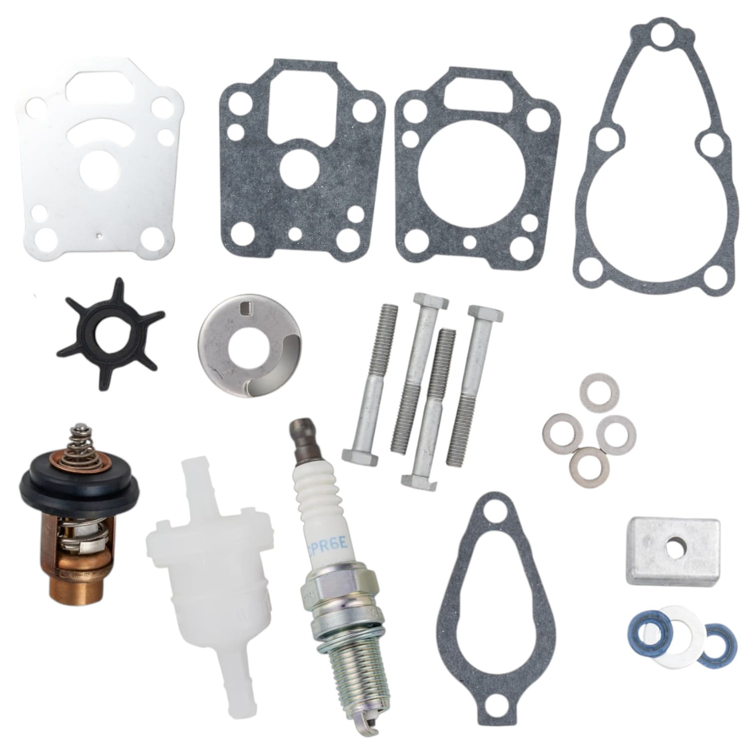 Zawiera świecę zapłonową, filtr paliwa, wirnik, zestaw naprawczy do pompy wodnej, uszczelki spustu oleju przekładniowego, uszczelkę spustu oleju silnikowego, anodę i termostat z uszczelką