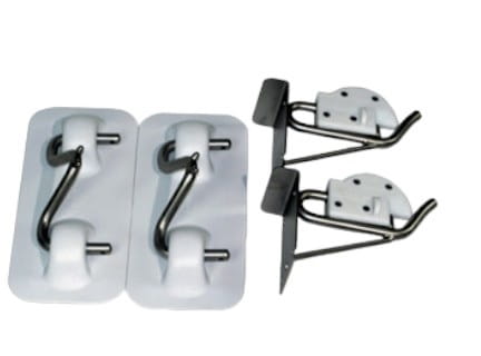 Żurawiki zatrzaskowe do pontonów: dwa karabińczyki są przymocowane do pokładu, a dwie płyty podstawy z PVC są przymocowane do pontonu w tej samej odległości. Jeśli planowane jest podniesienie nadmuchiwanej łodzi, wsporniki zawieszenia są wsuwane w płyty podstawy z PVC i mocowane za pomocą zacisków sprężynowych. Następnie łódź jest prowadzona wzdłuż pomostu kąpieliska, a wsporniki zawieszenia są zakotwiczone w dwóch karabińczykach. Łódź można teraz bezpiecznie i wygodnie podnieść i przymocować do jachtu. Niezbędne jest użycie silikonu morskiego i śrub ze stali nierdzewnej A4 do przymocowania go do łodzi. Do mocowania do nadmuchiwanej łodzi zalecany jest dwuskładnikowy klej, który oczywiście musi być również odpowiedni dla odpowiedniego materiału (PVC-Hypalon).