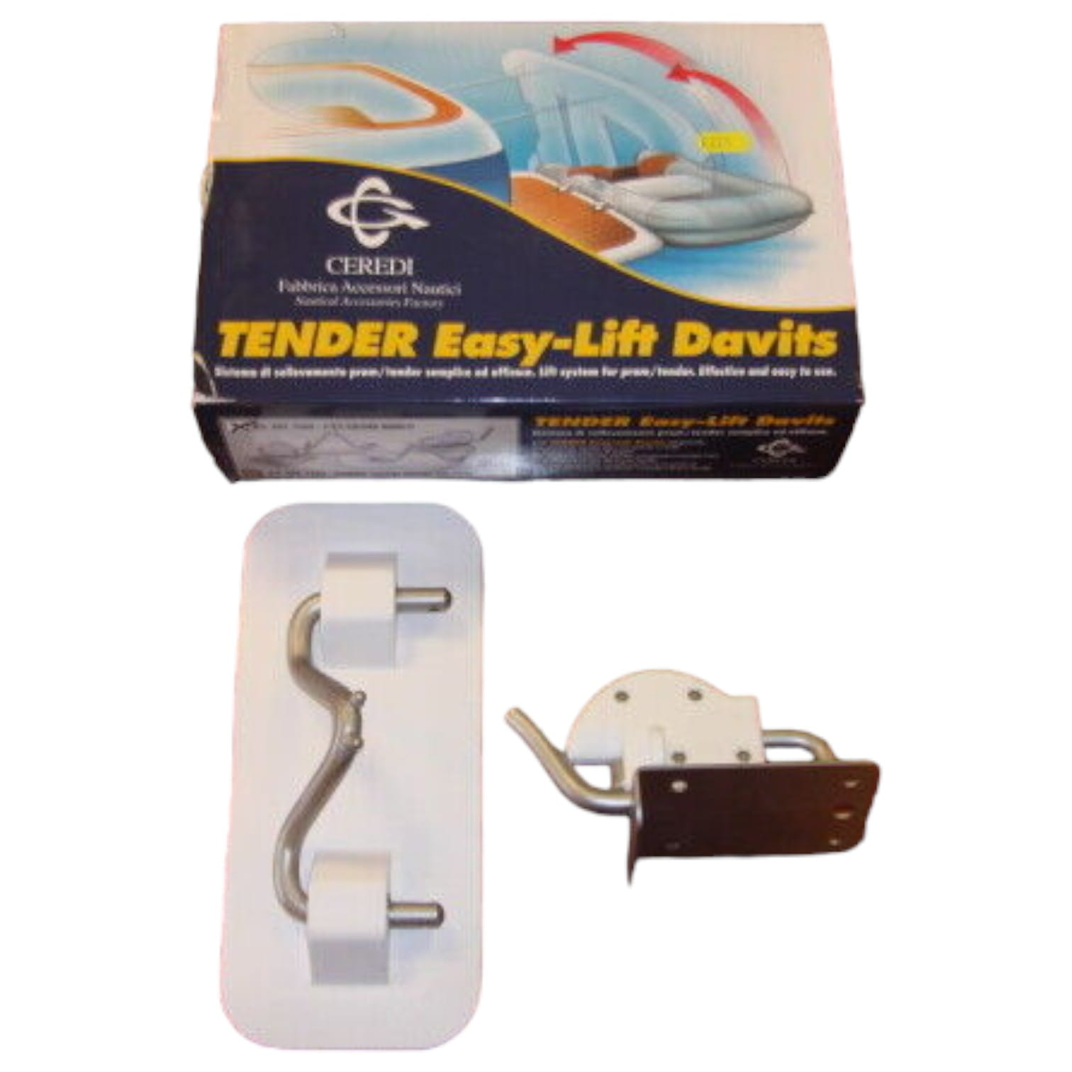 Żurawiki zatrzaskowe do pontonów: dwa karabińczyki są przymocowane do pomostu kąpieliska, a dwie płyty podstawy z PVC są przymocowane do pontonu w tej samej odległości. Jeśli planowane jest podniesienie nadmuchiwanej łodzi, wsporniki zawieszenia są wsuwane w płyty podstawy z PVC i mocowane za pomocą zacisków sprężynowych. Następnie łódź jest prowadzona wzdłuż pomostu kąpieliska, a wsporniki zawieszenia są zakotwiczone w dwóch karabińczykach. Łódź można teraz bezpiecznie i wygodnie podnieść i przymocować do jachtu. Niezbędne jest użycie silikonu morskiego i śrub ze stali nierdzewnej A4 do przymocowania go do łodzi. Do mocowania do nadmuchiwanej łodzi zalecany jest dwuskładnikowy klej, który oczywiście musi być również odpowiedni dla odpowiedniego materiału (PVC-Hypalon).